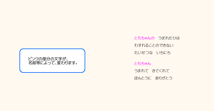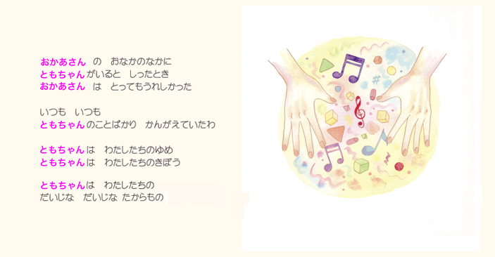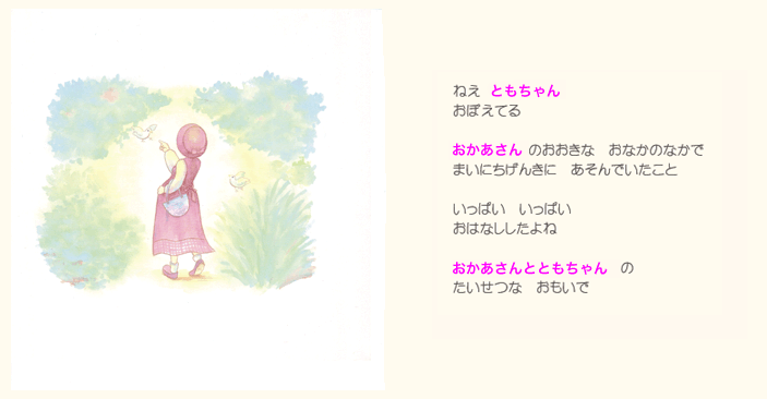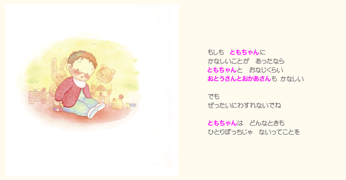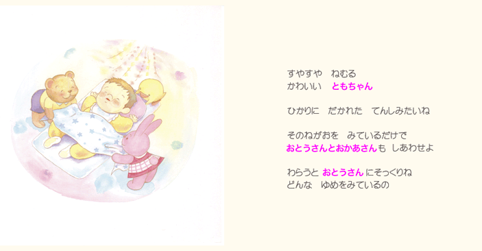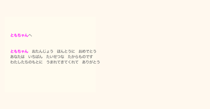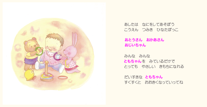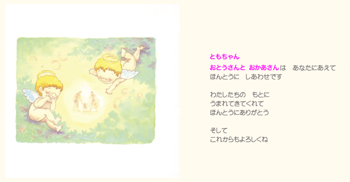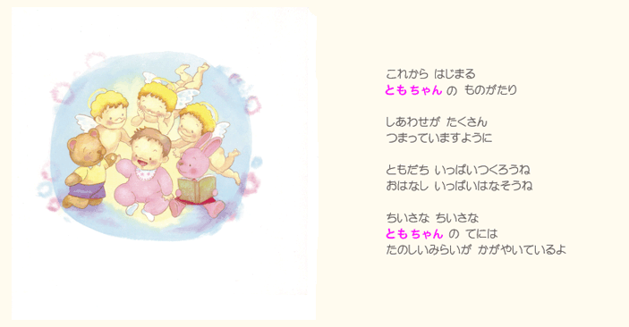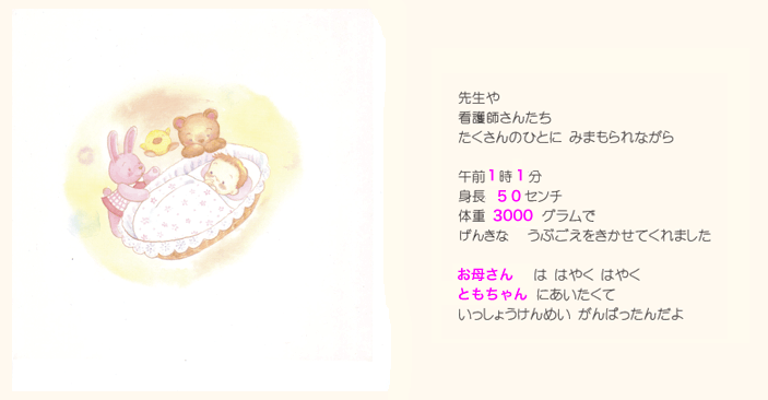 そしてお子様の誕生を心より祝福してくださった人たち(おじいちゃんやおばあちゃん、ご兄弟)の お名前やメッセージなどが絵本に印字されます。