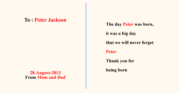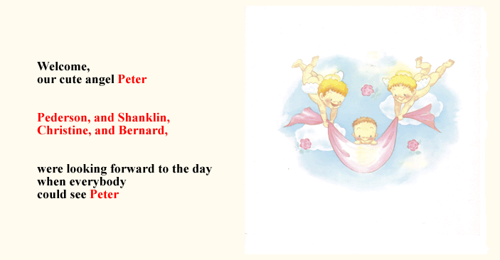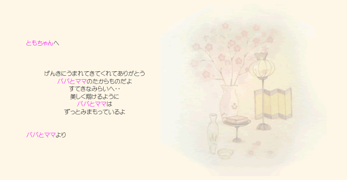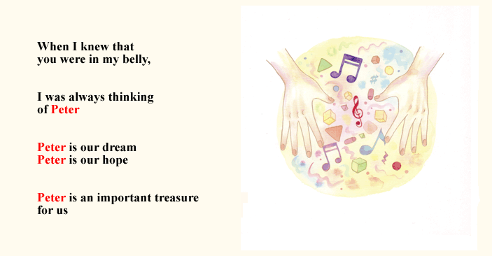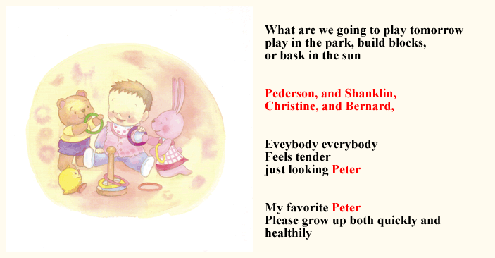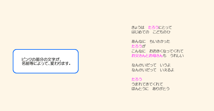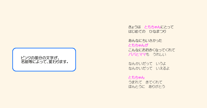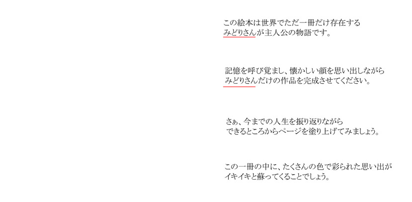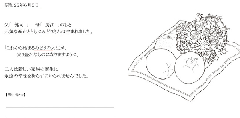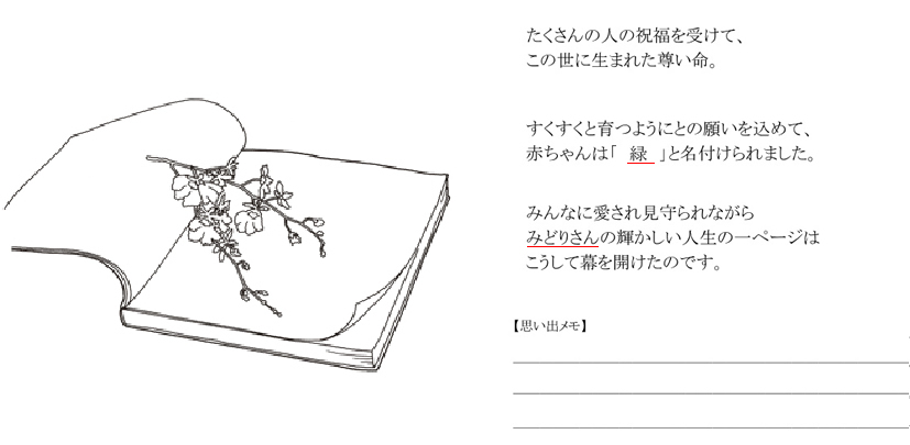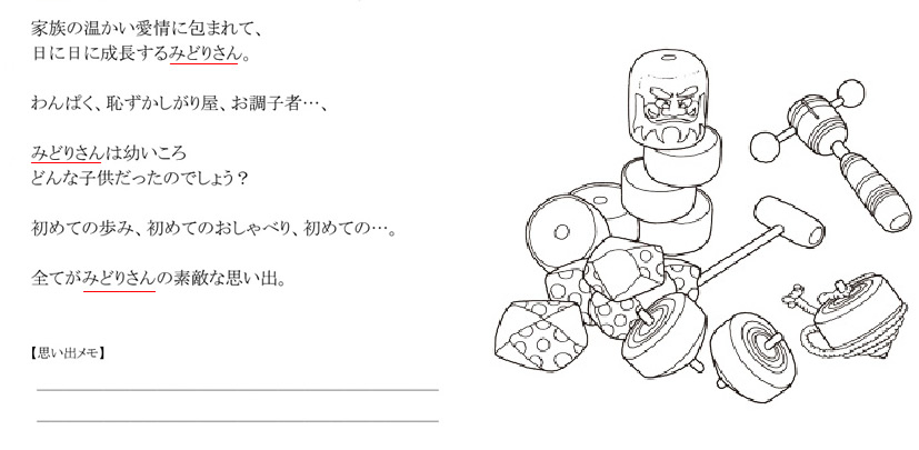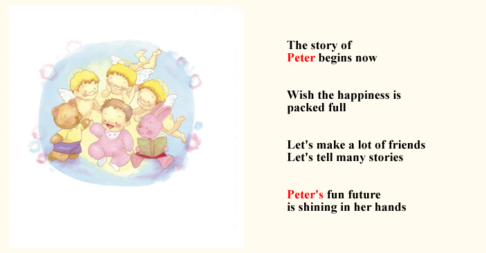 MYBOOKは、基本的なオリジナルストーリーに、 ■主人公になるお子様の名前 ■生年月日 ■出生時間、身長、体重 ■生まれた病院名、住所 ■先生、看護婦さんの名前 ■お父さん・お母さんの名前 ■おじいちゃん・おばあちゃんの名前 ■お兄ちゃん・お姉ちゃんの名前 ■プレゼントした人からのメッセージ ■その他・絵本によって追加挿入項目 (人形店名・住所・英語・ぬりえキーワードなど) ※省略して簡単にする事も可能です。
