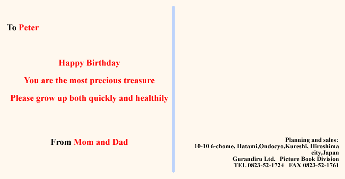 今まで約18年間、産婦人科様をはじめ人形店、玩具店、写真館、保険会社、幼児教室、デイサービス、老人ホーム、英会話教室など、 様々な業種の方にこのオリジナル絵本をお取り扱いして頂きました。