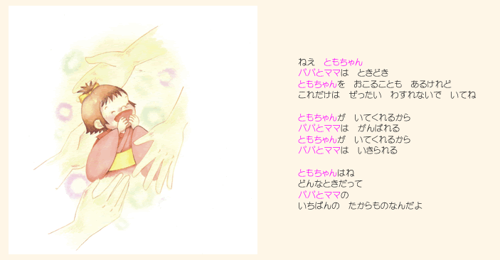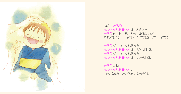 子供とスキンシップがとれるツールとして、今改めて絵本の良さが見直されています。 父親、あるいは母親の温もりの中で絵本を読んでもらうということは 子供に、この上ない安心感を与え、子供の心に優しさの土壌を育み、 後の人格形成にも大きな影響を与える、と言われています。