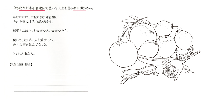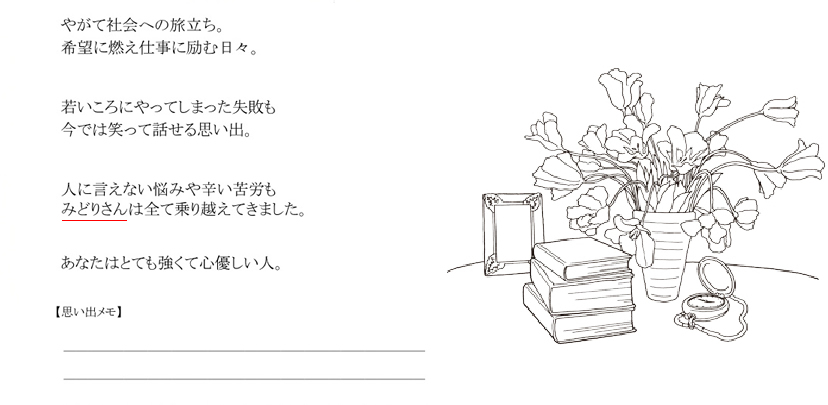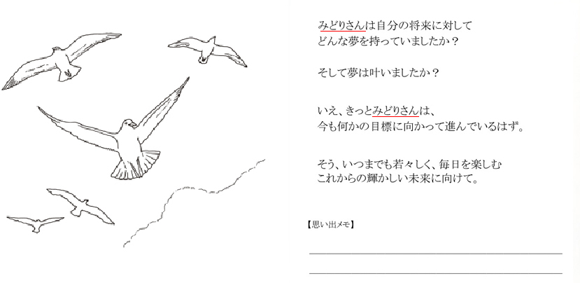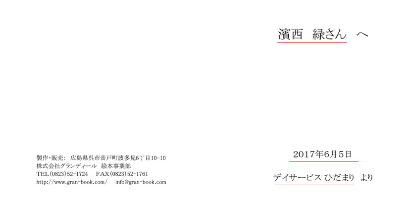 と、プレゼントした人・お店の名前が入り、最後のメッセージページにも同様に 企業やお店の名前が「○○より」と入りますので、年月が経っても色あせず ご商売の告知ができるのが特徴です。