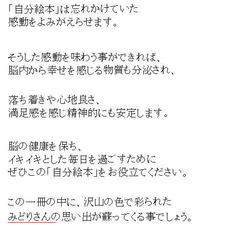 弊社は今まで子供向けの絵本を製作しておりましたが、これからの高齢化社会を見据え、新しく脳の活性化や認知症予防にも役立つ中高年向けの「オリジナル自分絵本」を完成させました。