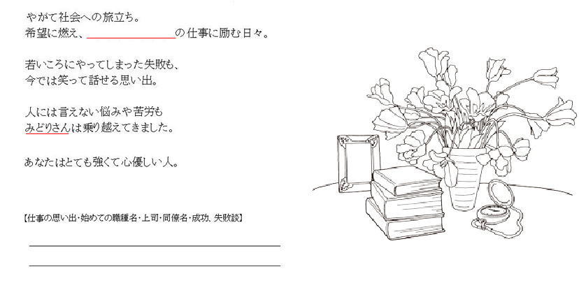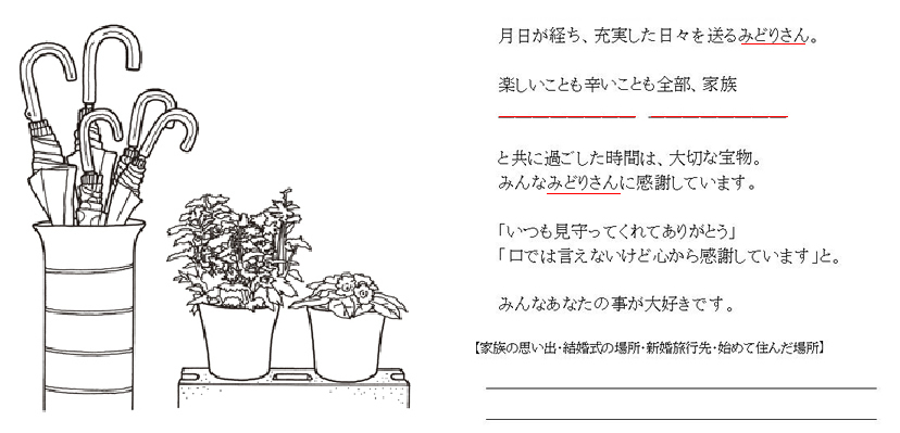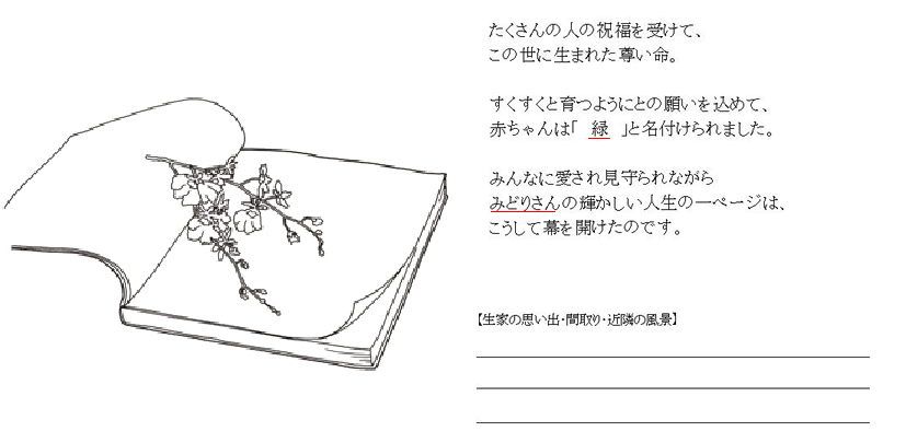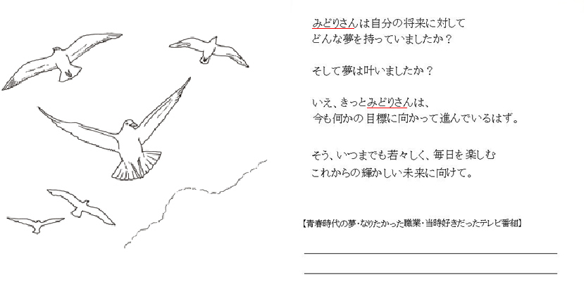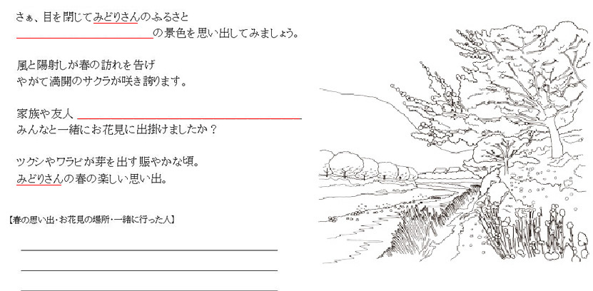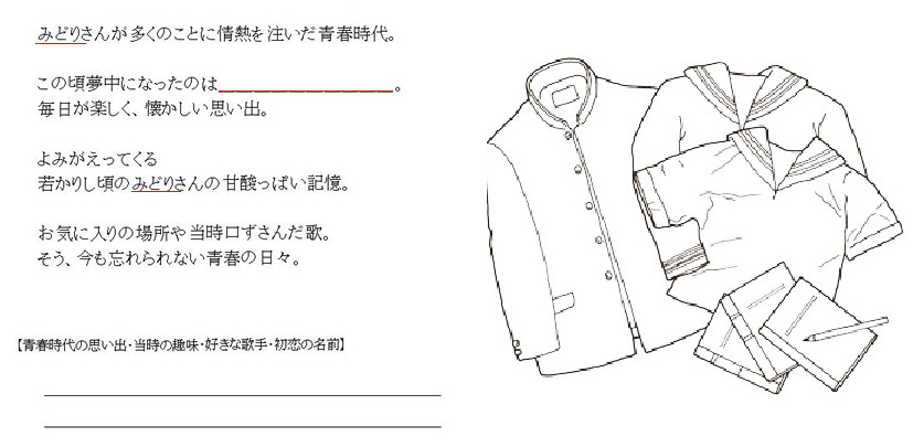 出身地や旧友などキーワードを思い出し、自分で記入して完成させる「記入式バージョン」絵本をお送りしております。