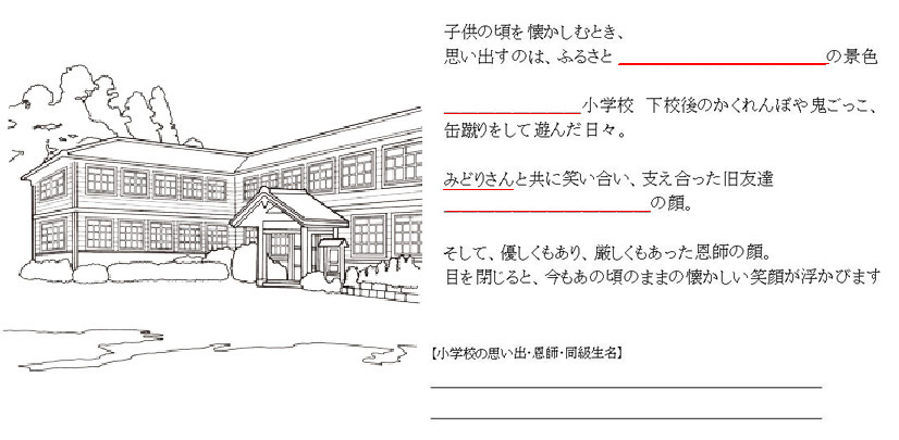 この記入式の場合は小学校名や同級生名、ふるさとの名前から青春時代のキーワード、その他を記入し完成させる絵本になっております。思い出そうとする事で脳が活性化し、認知症予防にもつながると言われておりますので、施設様のプログラムの一環としてもお使い頂けます。